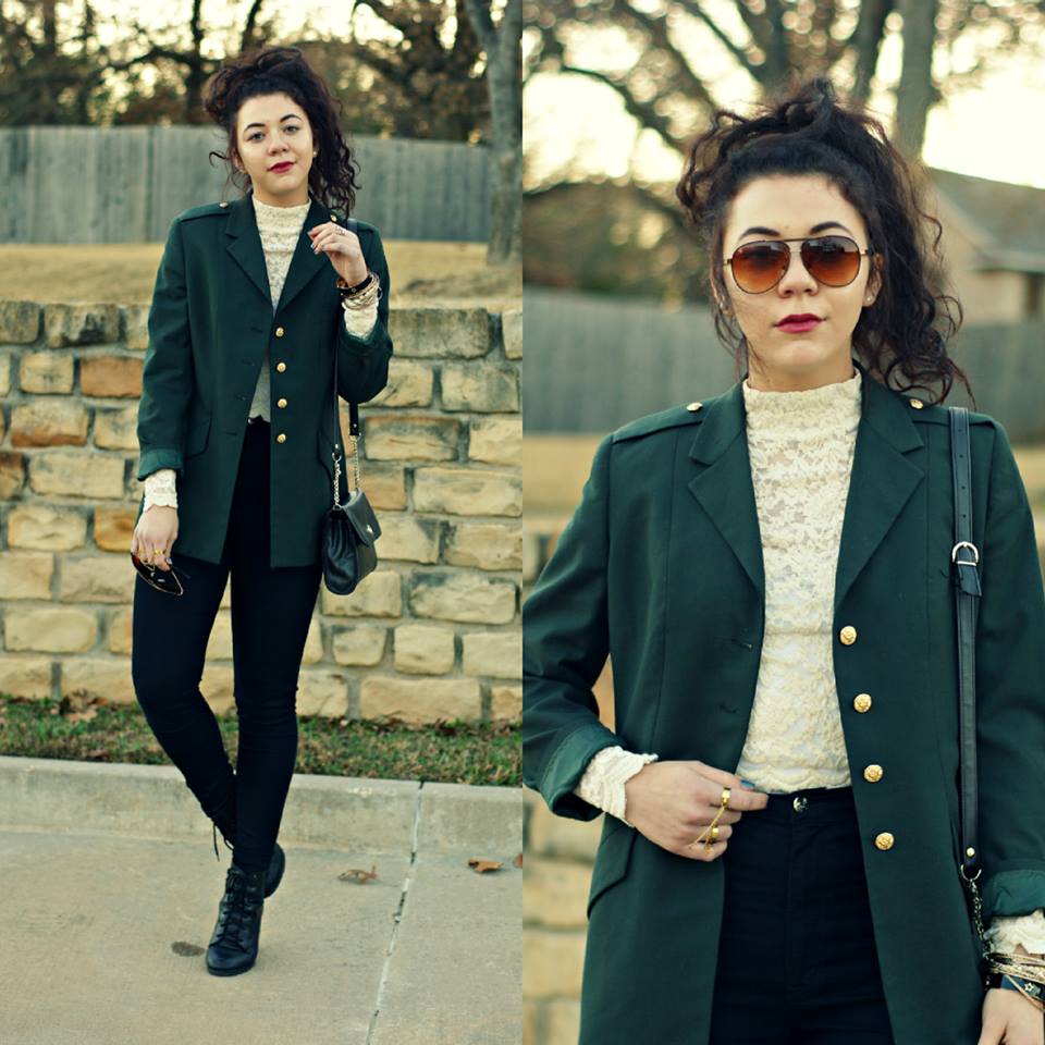 olive green blazer-Goodwill lace top-Threadsence high-waisted pants-GoJane booties-UrbanOG